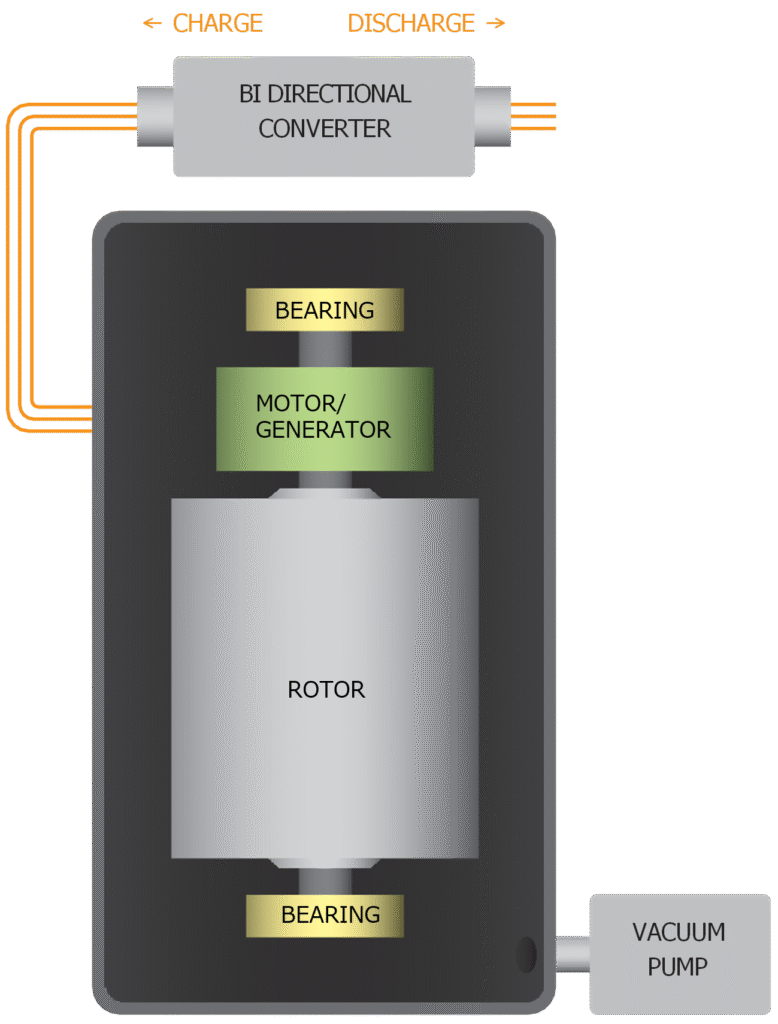 フライホイールは、電気を「回転エネルギー」という形で一時的にためておく装置です。電気が必要なときには、すぐに取り出せるのが特長で、充電・放電を何度繰り返しても劣化しにくいのが大きなメリットです。クリーンで高速なエネルギーの出し入れを実現する新しい蓄電技術です。